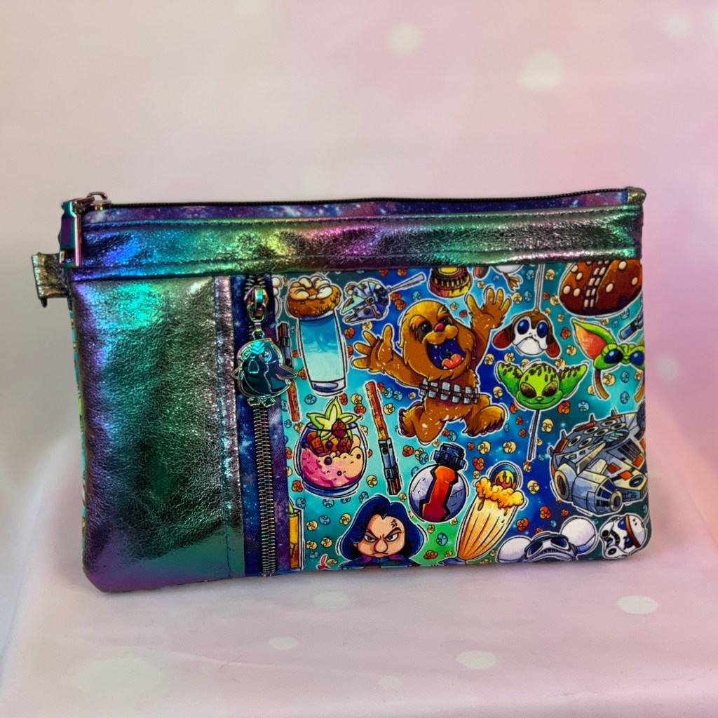 The pixie pouch is a versatile bag that can be custom made with or without an optional front zipper pocket. The finished bag can be used as an organizational bag (“planner pouch” style) or as a clutch with an optional d-ring affixed to the side of the bag. Finished dimensions are approximately 6.5″ tall by 10.5″ wide. Request a pixie pouch or clutch custom made to your specifications here.